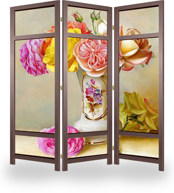 Описание ширмы На светлом фоне стоит букет свежесрезанных роз. Букет состоит из цветов разных оттенков и сортов роз. На вазочке нанесен орнамент из цветов. На столике лежат две розочки.