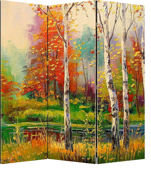 Описание ширмы Картина маслом на холсте,яркая картина маслом на холсте,картина маслом для интерьера,картина маслом на подарок,живопись,импрессионизм,природа,пруд,лес,березы,осень,принт,постер