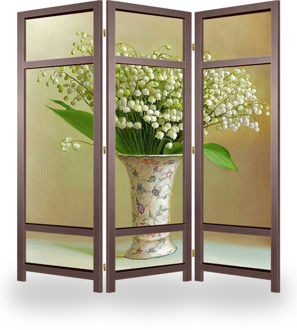 Описание ширмы Этот букет ландышей я расположил так, что бы свет, падающий из окна, был боковым. Такое освещение мне показалось интересным и необычным. Светлый фон и белый атлас придают букету легкость и выразительность.