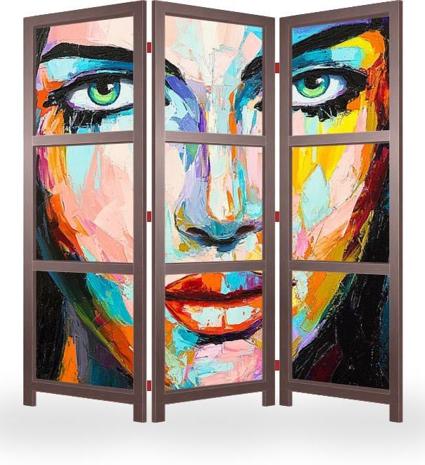 Описание ширмы Портрет девушки из серии "эмоции в ярких красках". Выполнен в технике крупных мазков, смесь стилей стрит- и поп-арта. Подходит для оформления смелых интерьеров. Масло, мастихин, холст, 2016