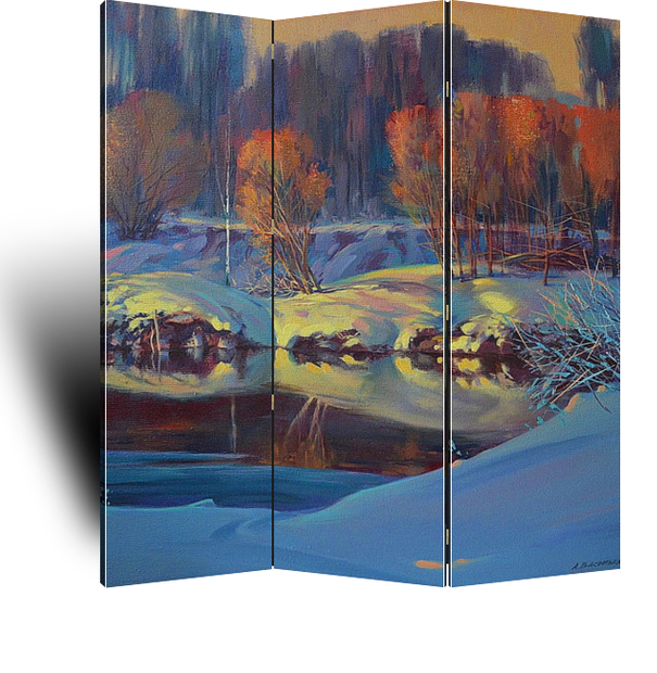 Описание ширмы Картина "Свет" написана с натуры, точнее быстрый этюд, с последующей доработкой в мастерской, так как закаты быстротечные, особенно зимние. Это начало прошлогодней зимы, река еще не замерзла.