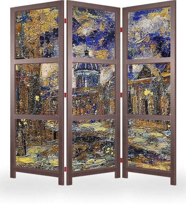 Описание ширмы Дарья применят одновременно или поочередно несколько различных техник в написании картин . Смешение разных техник, эмоционально-продуманный налёт эскизной недоделанности и способность придать городским пейзажам некую интимность, что сильно отличает