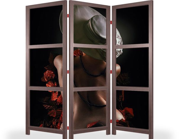 Описание ширмы Фотография силуэта девушки сидящей на стуле обращённой к нам спиной. На ней белая шляпа, бусы. Всё это в обрамлении красных листьев. фото сделано в студии.
