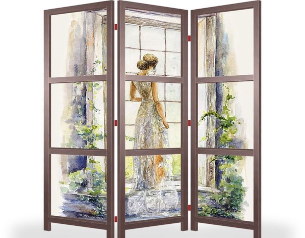 Описание ширмы Картина написана акварелью. Она будет хорошо смотреться в спальне или в комнате нежной барышни. Пастельные тона, свет идущий из окна и хрупкая фигурка.