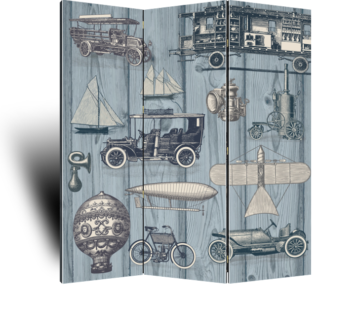 Описание ширмы Ширма с изображением различного транспорта прошедших годов в холодных оттенках будет отлично смотреться в гостиной.