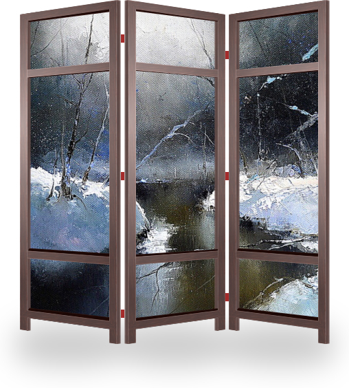 Описание ширмы Работа выполнена на льняном холсте ( производство Вышний Волочёк ) на подрамнике, корпусный, акриловый подмалевок + масло ( Италия/Голландия ), работа выполнена в оригинальной технике ( Know how ) присущей только Игорю Медведеву.