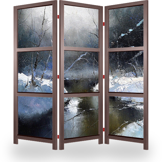Описание ширмы Работа выполнена на льняном холсте ( производство Вышний Волочёк ) на подрамнике, корпусный, акриловый подмалевок + масло ( Италия/Голландия ), работа выполнена в оригинальной технике ( Know how ) присущей только Игорю Медведеву.