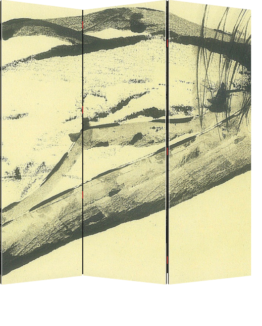 Описание ширмы рисунок из серии Прогулки по белому выполнен в традиционной для художника манере- тушью на тонированной бумаге, Попытка передать в абстрактной манере состояние зимнего пейзажа. Рисунок находится в собрании художника