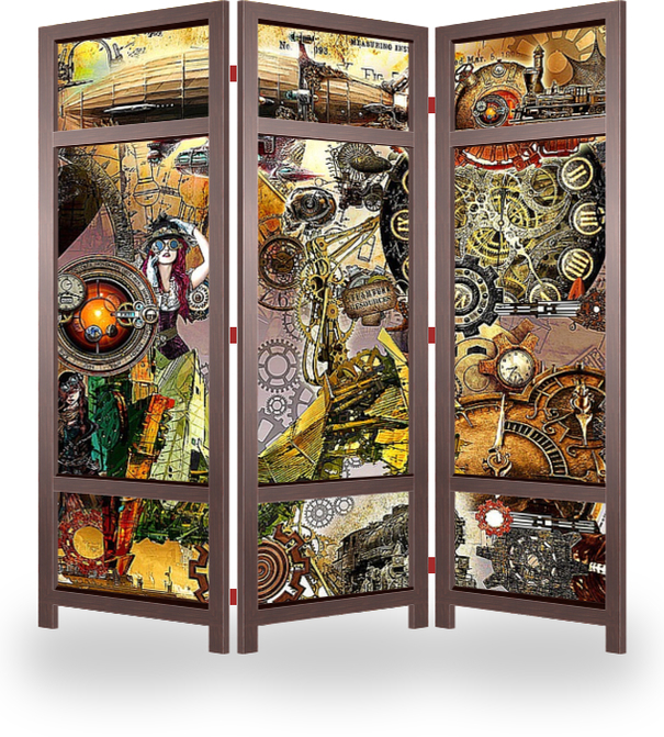 Описание ширмы Фантазийный коллаж в стиле стимпанк. Отражает всю сложность процесса промышленной революции и одновременно является актуальным и современным трендом. Утопическая и загадочная теория захватывает умы и заставляет нас мечтать.