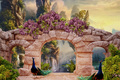 Изображение в интерьере каменной арки с цветами, прекрасными павлинами и ярким сказочным пейзажем на заднем фоне, украсит любую комнату.