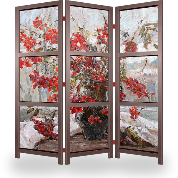 Описание ширмы Трогательный сюжет - букет из веточек рябины и калины, стоящий на окне на фоне первого ноябрьского снега. Контрасты красных ягод и холодных оттенков пейзажа заставляют зрителей ощутить восторг от долгожданного первого снега.