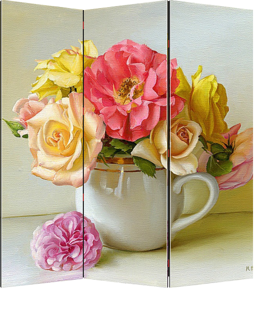 Описание ширмы На фоне светлой стены стоит букет розочек. Цветы и белая вазочка создадут в интерьере летнее настроение. Натюрморт написан в технике масляной живописи.