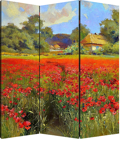 Описание ширмы Название "Макеевка" от слова маки.Украинская деревня на юг от Киева.По преданиям там всегда много росло красных маков.Картина написана по заказу в 2010 году.