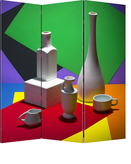 Описание ширмы Сюжет натюрморта "Геометрия цвета" акцентирует внимание зрителя на разноцветный фон, оттенки, светотени, что в общем перекликается с таким направлением в живописи, как авангардизм