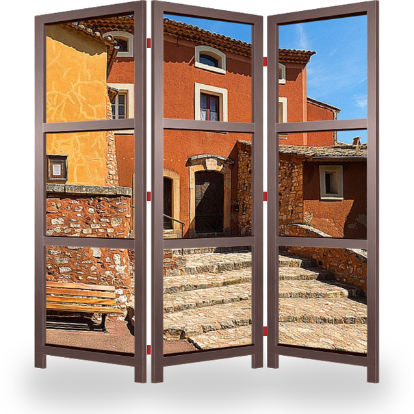 Описание ширмы Руссийон (Roussillon) - городок (коммуна) в регионе Прованс-Альпы-Лазурный берег, департамент Воклюз, округ Апт. Руссийон находится в 39 километрах к юго-востоку от Авиньона. Весь Руссийон покрашен в цвета охры, которая раньше добывалась в каменоломн