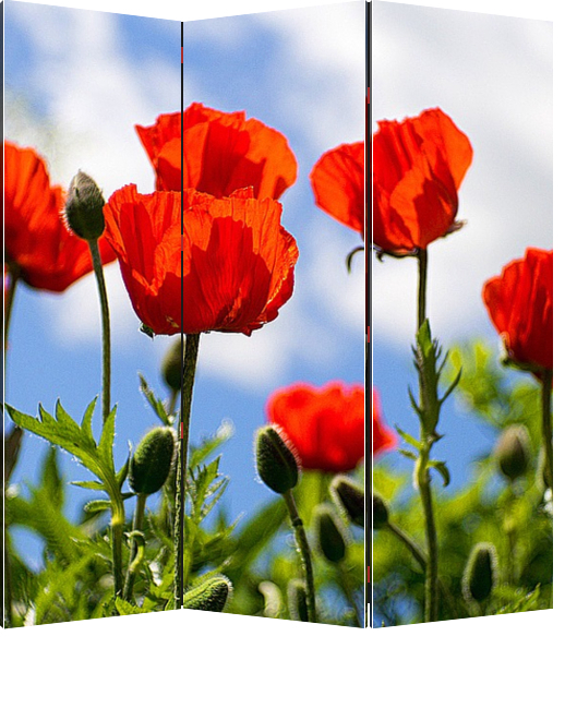 Описание ширмы Нежные алые маки горят огоньками на фоне неба... Постер с яркими цветами украсит ваше помещение, придаст свежести вашим чувствам, напомнит вам моменты общения с природой, перенесет в мир цветов, свежести, первозданной радости бытия...