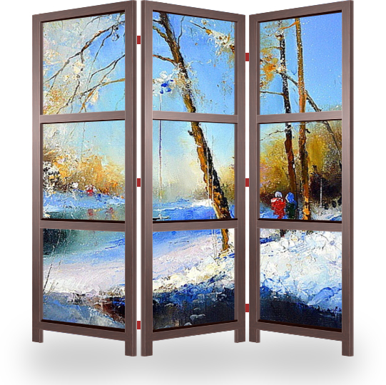 Описание ширмы Работа выполнена на льняном холсте ( производство Вышний Волочёк ) на подрамнике, корпусный, акриловый подмалевок + масло ( Италия/Голландия ), работа выполнена в оригинальной технике ( Know how ) присущей только Игорю Медведеву.