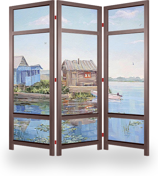 Описание ширмы Это одна из серии работ "Озеро Воже". На картине изображен островок с избушками, где останавливаются рыбаки. Вокруг тишина и покой, слышится лишь крик чаек.