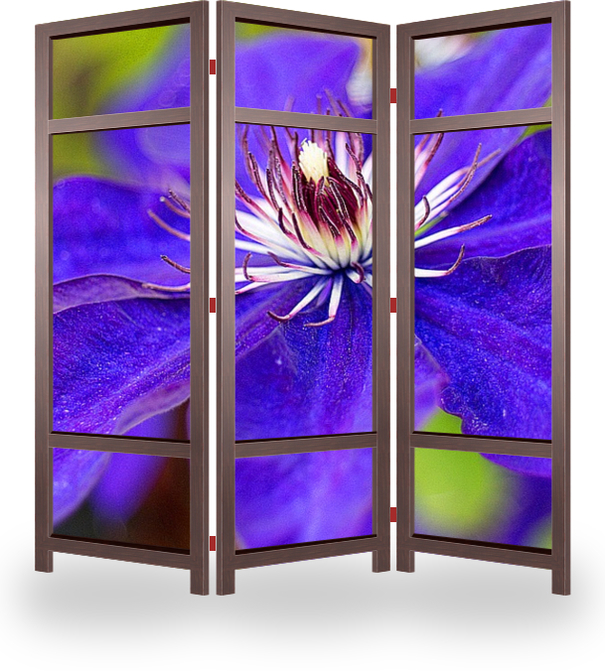 Описание ширмы Клематисы - удивительные, яркие цветы...Постер с яркими цветами украсит ваше помещение, придаст свежести вашим чувствам, напомнит вам моменты общения с природой, перенесет в мир цветов, свежести, первозданной радости бытия...