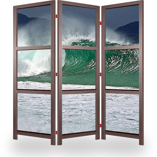 Описание ширмы Моря без волн не бывает, его поверхность всегда колеблется. Иногда это лишь легкая рябь на воде, иногда ряды гребней с веселыми белыми барашками, иногда грозные валы, несущие тучи брызг.