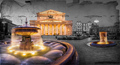 Изображение фонтанов у Большого театра, расположенного в центре Москвы, на Театральной площади в ночное время суток, украсит любую комнату.