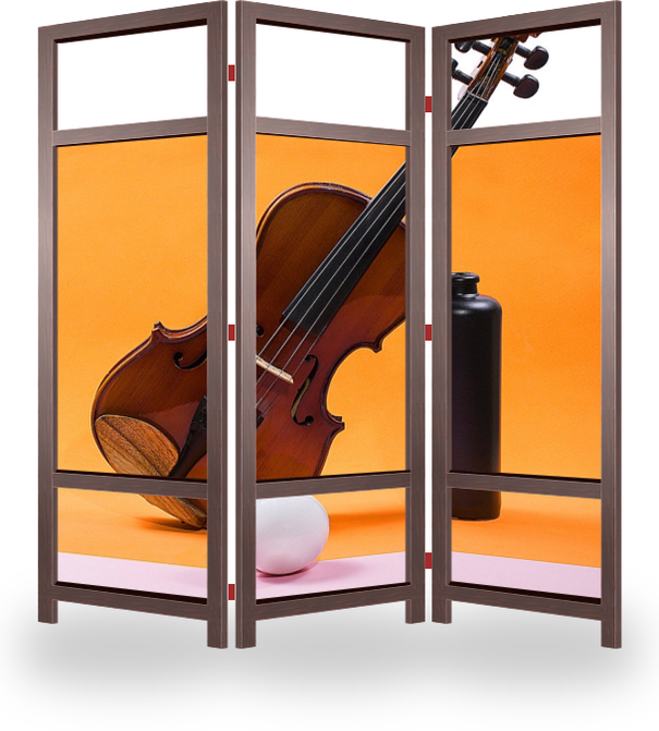 Описание ширмы Натюрморт со скрипкой, шаром и бутылкой на оранжевом фоне. Скрипка и вазы являются прекрасными объектами для съёмки в различных условиях и всегда прекрасно смотрятся.