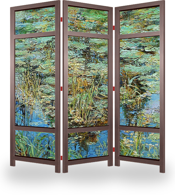 Описание ширмы Спокойный пейзаж с водой вызывает умиротворенность при созерцании. Спокойная вода,спокойные зеленовато-голубые тона притягивают взгляд. И хочется смотреть на картину снова и снова.