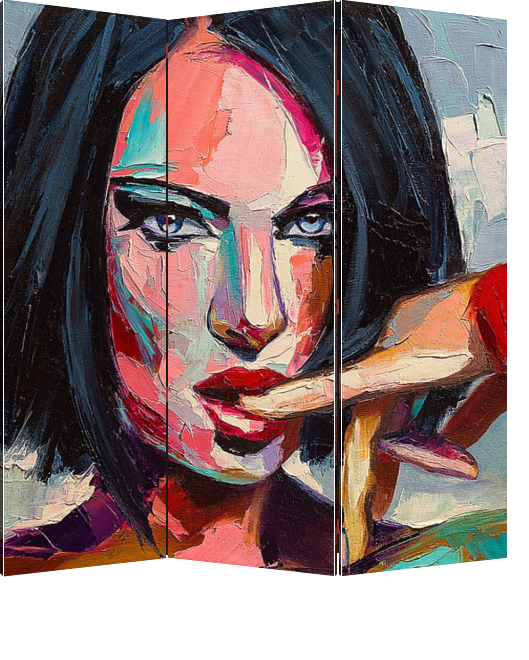 Описание ширмы Портрет женщины из серии "эмоции в ярких красках". Выполнен в технике крупных мазков, смесь абстрактного стиля и поп-арта. Подходит для оформления смелых интерьеров. Масло, мастихн, холст, 2017