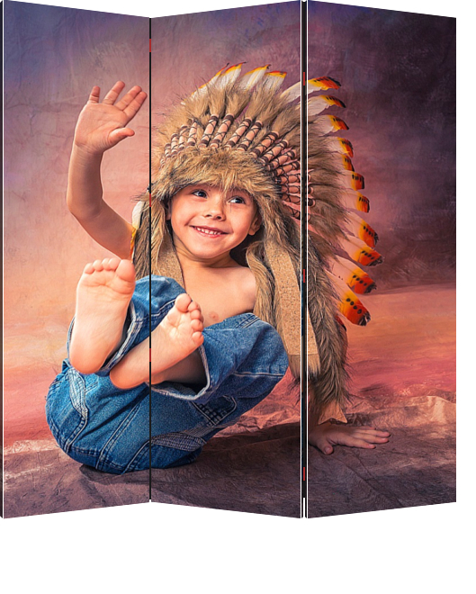 Описание ширмы Мальчик индеец падая смеётся. Его не пугает падение. Он приветливо машет ручкой своим близким. Маленький вождь знает, что можно всегда снова встать на ноги. Ему нравится статус и корона. Она ему не в тягость. Власть не испортит маленького, игривого м