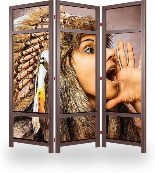 Описание ширмы Головной убор тихоокеанского аборигена пришёлся кстати симпатичной девушке. Ей необходимо донести важную новость до слушателя. Порой это непросто. Необходимо докричаться. У индейцев была голосовая почта. Посланец от вождя племени должен был передать