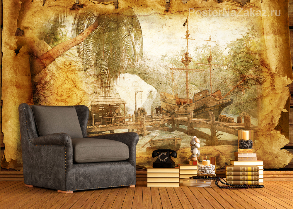 Фотообои с пиратским кораблем, отличное и оригинальное дополнение к оформлению комнаты в пиратском морском стиле.