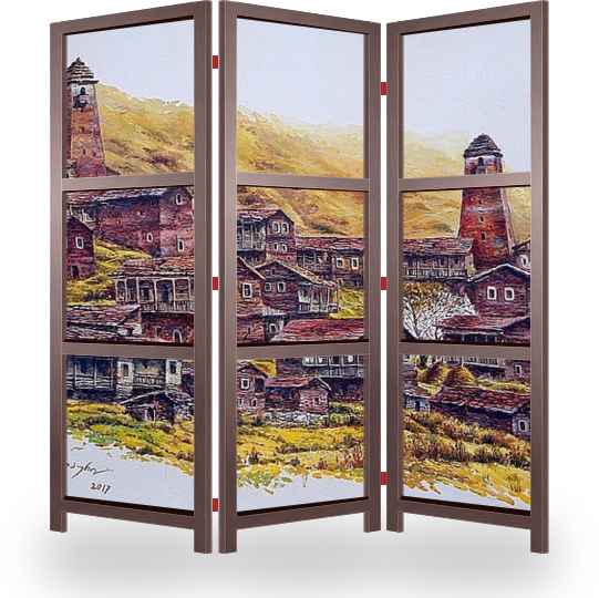Описание ширмы На картине "Тушети" (оригинал - графика, бумага / акварель + гуашь, 35х49 см., 2017 г.) изображена историческая и географическая горная область на северо-востоке Грузии. Характерны укреплённые поселения с башенной архитектурой.