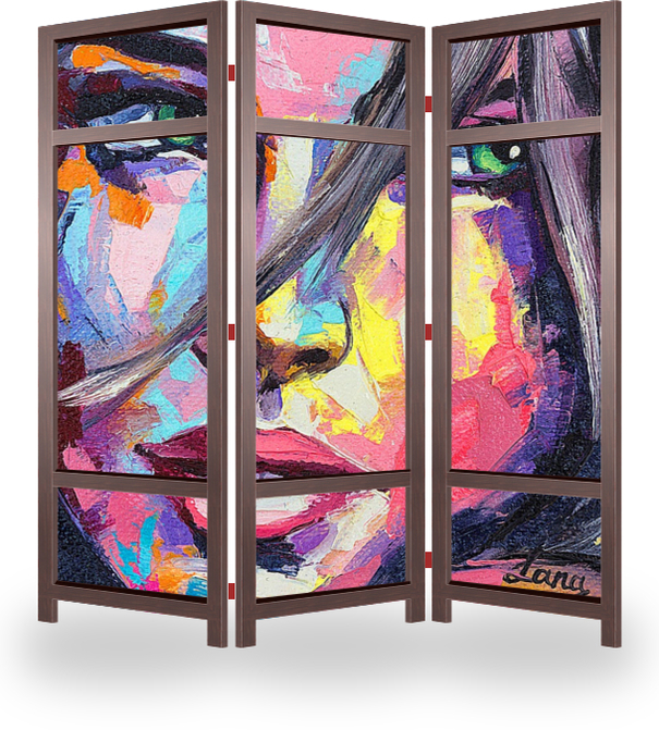 Описание ширмы Портрет выдуманной женщины из серии "эмоции в ярких красках". Выполнен мастихином в технике крупных мазков, смесь абстрактного стиля и поп-арта. Идеально подходит для оформления смелых интерьеров.