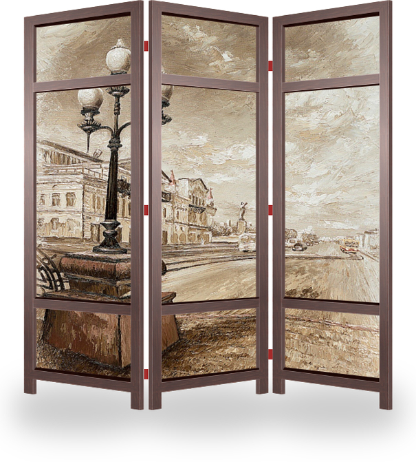 Описание ширмы Картина выполнена на холсте масляными красками мастихином. Написана в сепии, хотелось чтобы картина напоминала старую фотографию. Изображён центральный проспект города Екатеринбург.