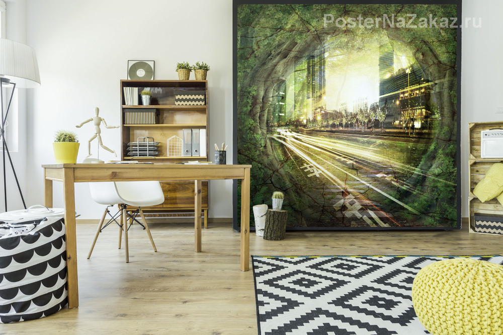 Изображение в интерьере иллюзии портала из густого леса, ведущего на городские улицы, придаст загадочности вашей комнате.