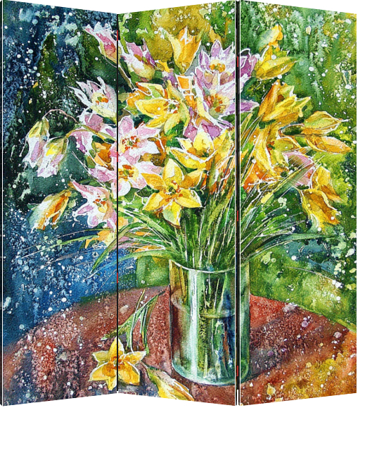 Описание ширмы Работа выполнена акварелью. Картина будет красиво смотреться в светлом интерьере. Хорошо подойдет для интерьера спальни. Придаст нежность и уют загородному интерьеру, наполнит его ярким пятном.
