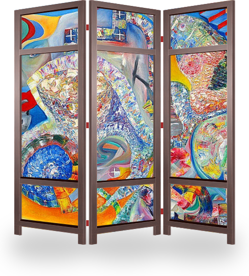 Описание ширмы Картина написана в состоянии вдохновения . Символизирует бесконечный акт творения , Взывает к осознанию происходящего в мире , в том числе внутреннем и побуждает стремление к самореализации и постижению в движении.