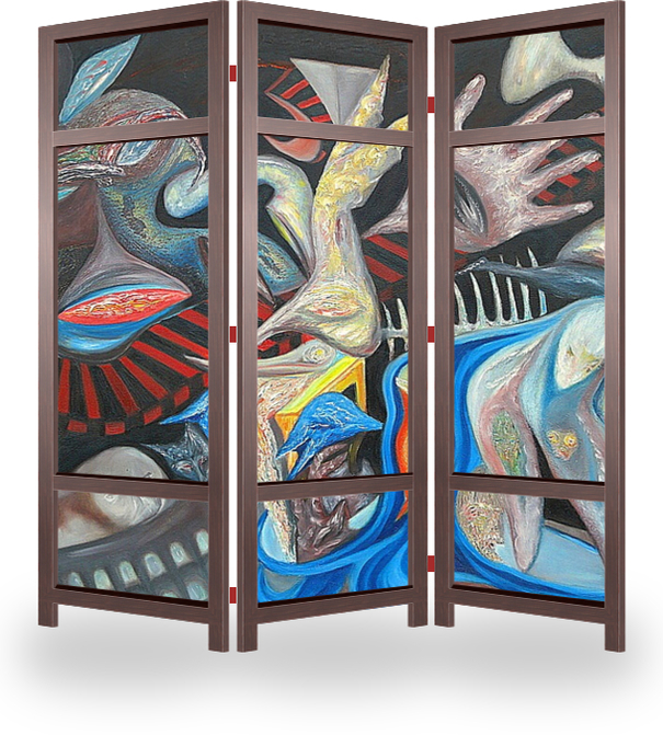 Описание ширмы Картина была написана в 1996г. Первая картина на холсте . Откровение на тему "Трансформация и Преображение" .Глубокое погружение в себя. Переосмысление жизни и переоценка ценностей ."Я камнем падал вниз тогда . Я был так мёртв , как никогда, Тогда
