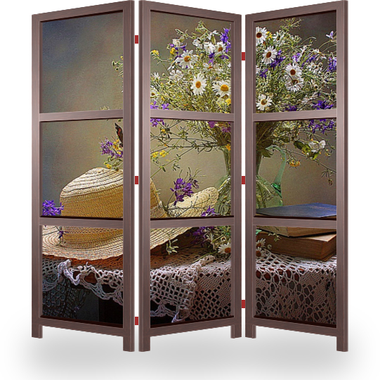 Описание ширмы Беззаботный вечер на даче в компании букета полевых цветов и любимой книги - что может быть лучше? Шляпка и вязаная скатерть ручной работы дополняют композицию, придавая ей деревенский колорит.