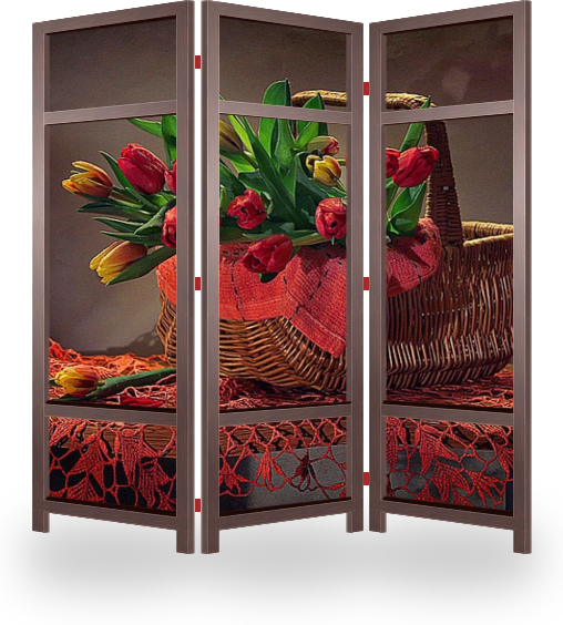 Описание ширмы Тюльпаны - нежный символ весны. Трудно найти человека, который был бы равнодушен к этим изящным благородным цветам! Корзинка ярких тюльпанов в сочетании с алой ажурной салфеткой - яркий штрих в вашем интерьере!