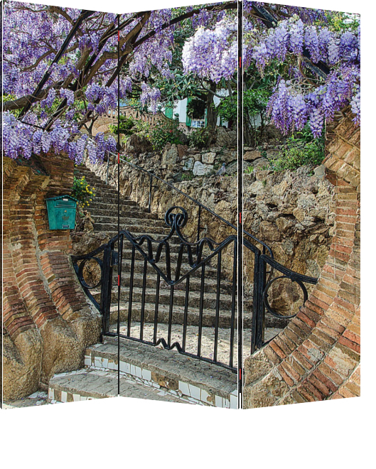 Описание ширмы Еще акация одна С цветами ветви опускала И над беседкою весна Душистых сводов не скругляла. Дышал горячий ветерок, В тени сидели мы друг с другом, И перед нами на песок День золотым ложился кругом.