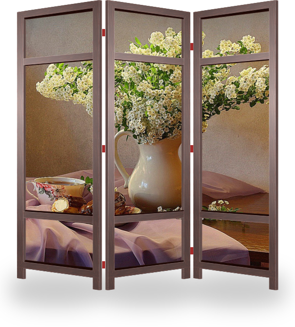 Описание ширмы Классическая композиция с букетом цветущей спиреи и любимыми эклерами. Работа выполнена в приятных пастельных оттенках. Тон натюрморту задает живописно ниспадающая со стола светло-сиреневая вуаль.