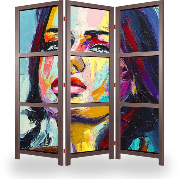 Описание ширмы Портрет женщины из серии "эмоции в ярких красках". Выполнен в технике крупных мазков, смесь абстрактного стиля и поп-арта. Великолепно подходит для оформления смелых интерьеров.