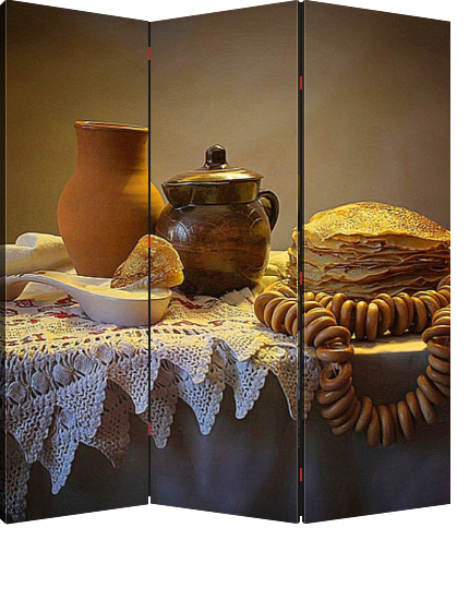 Описание ширмы Кухонный натюрморт в лучших русских сельских традициях: горка золотистых блинов, глиняные крынка и кувшинчик, рушник с вышивкой начала прошлого века и связка баранок.