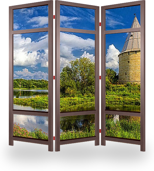 Ширма эконом отлично подойдет для временного размещения, рекламы, для отгораживания объектов интерьера и его дополнения. Лицевая сторона с изображением, обратная сторона открытый каркас