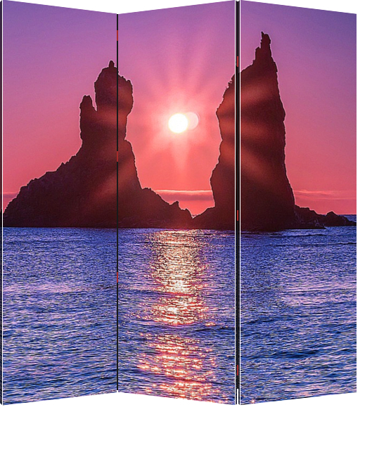 Ширма "Солнце всходит между двумя скалами братьями близнецами, которые возвышаются над морской рябью"