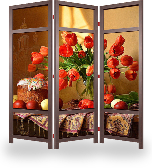 Описание ширмы Светлое Христово Воскресение — древнейший и самый важный христианский праздник. Букет красных тюльпанов в стеклянной вазе. Кулич, яйца, окрашенные луковой шелухой и тополиными веточками.