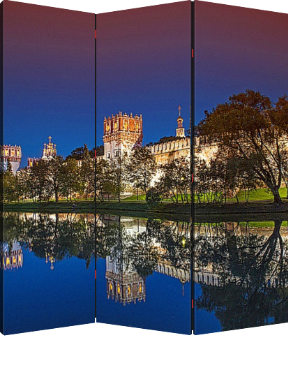 Описание ширмы Тихий вечер у стен Новодевичьего монастыря в Москве. Догорает закат. В воздухе ни ветерка, зеркальная гладь воды, отражения деревьев в пруду у стены монастыря.