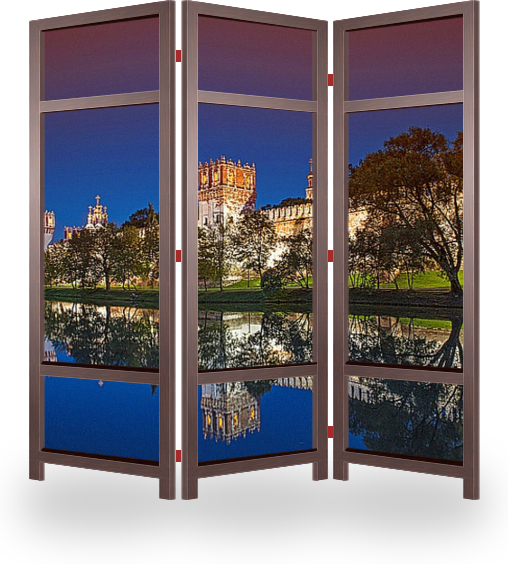 Описание ширмы Тихий вечер у стен Новодевичьего монастыря в Москве. Догорает закат. В воздухе ни ветерка, зеркальная гладь воды, отражения деревьев в пруду у стены монастыря.