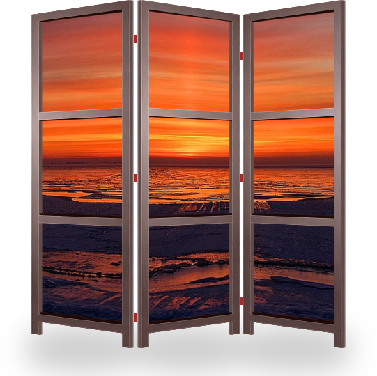 Описание ширмы "Первое, что я вижу, - это простор. Необозримая равнина. И если бы не холодный цвет, когда-то синий, в другой раз фиолетовый, а на закате - уходящий в багровый, то можно подумать, что это пустыня. Те же складки наводит на ее поверхности продувной вет